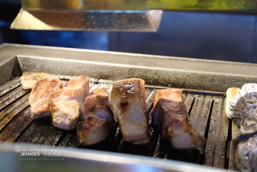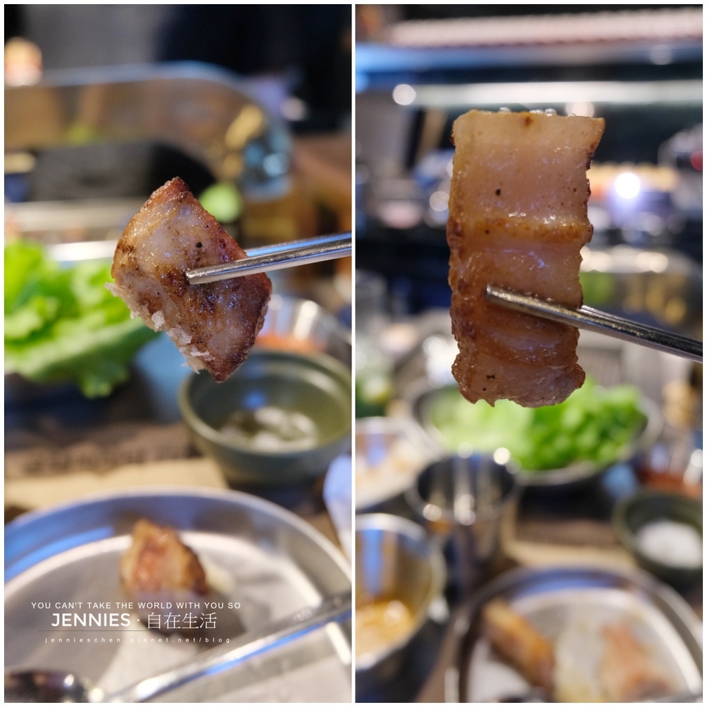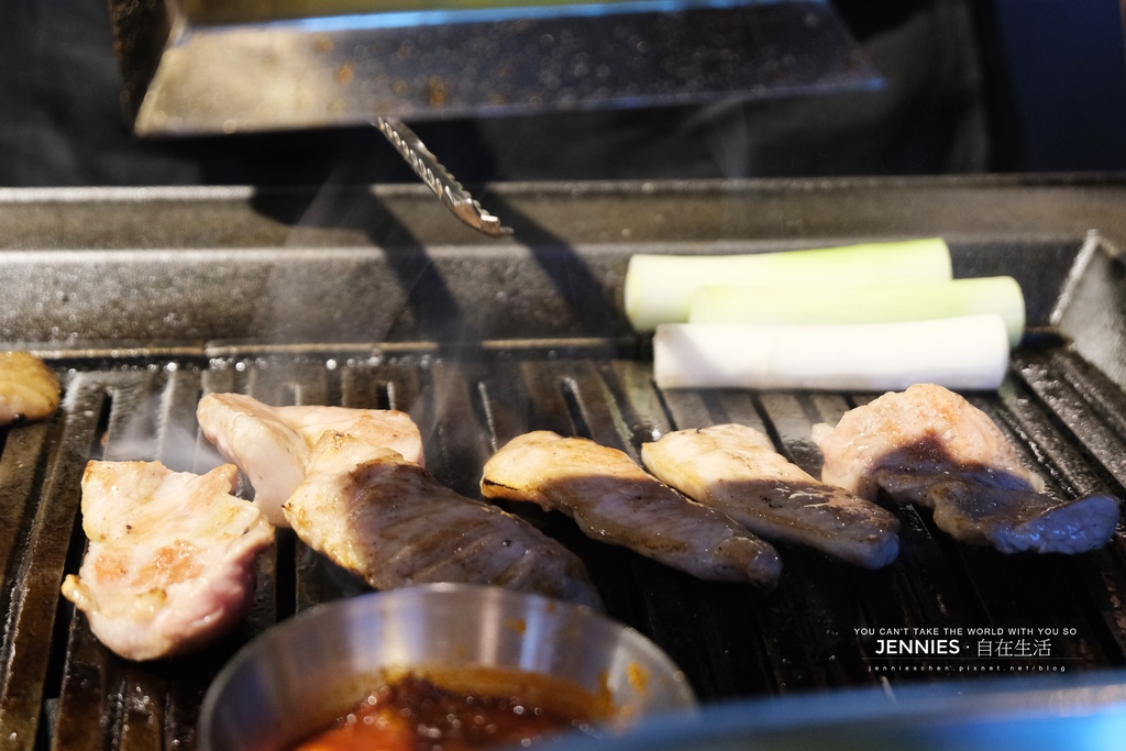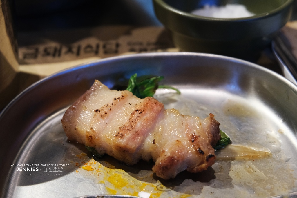 全程桌邊代烤,畢竟好的肉質還是要有專業人士烤才能烤出豬肉最佳口感,現場不斷用一小塊豬皮來回在烤盤上擦拭讓烤盤保持最佳滑潤狀態,肉一上去,滋~的一聲肉汁直接被原地封印!
