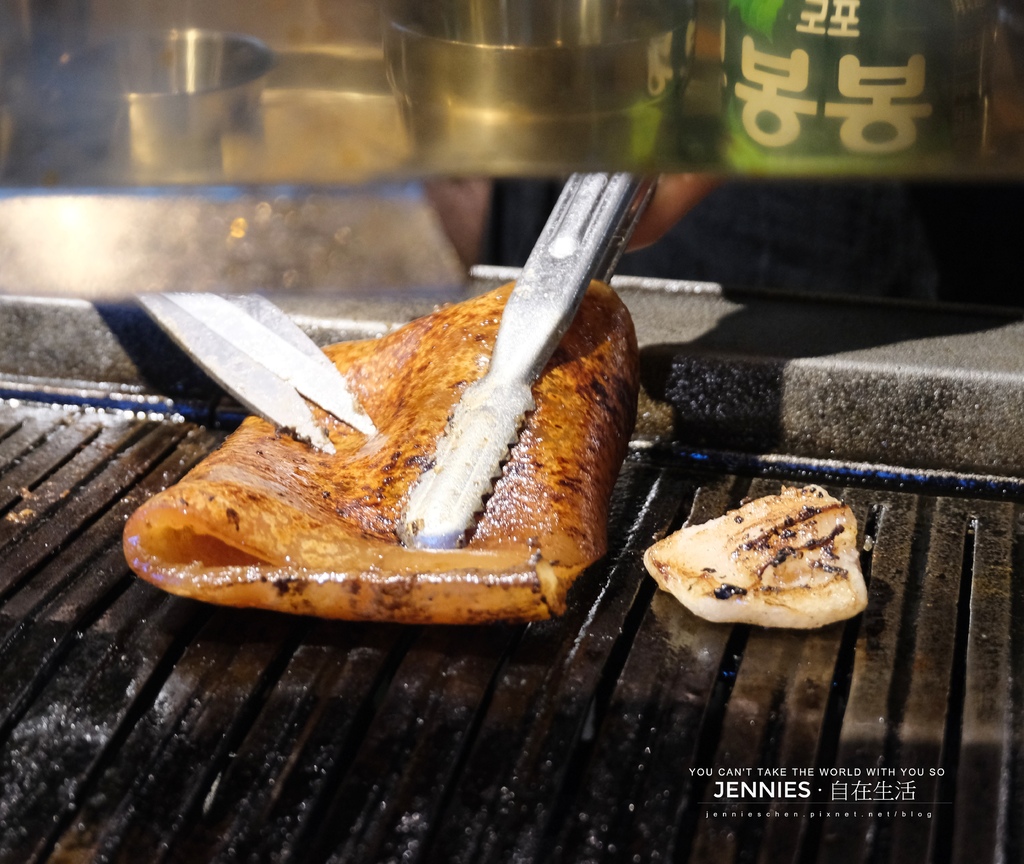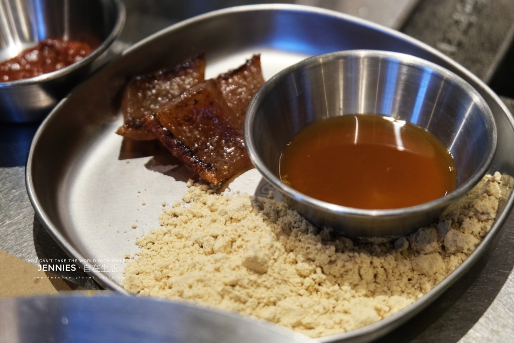 豬皮事先醃漬再經炭火烘烤至表面帶焦糖色澤,內裡保留膠質Q彈。搭配韓國在地吃法:醬油+黃豆粉。這組合聽起來奇妙,吃起來卻是鹹中帶甜豆香回甘,讓人一口接一口,驚訝中還帶點上癮感。烤豬皮(껍데기)在韓國是一種聚餐儀式的象徵。有著結尾之意也象徵慶祝。它的口感實在太特別很有嚼勁,跟我們吃的豬頭皮不像,帶有甜甜的焦香,我吃個兩片就覺得夠了!再咬下去牙齒會酸(笑~)