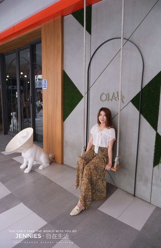 門口設置了吊椅鞦韆與白色法鬥犬雕像,不只可愛也是每個旅客都想合影的打卡點。