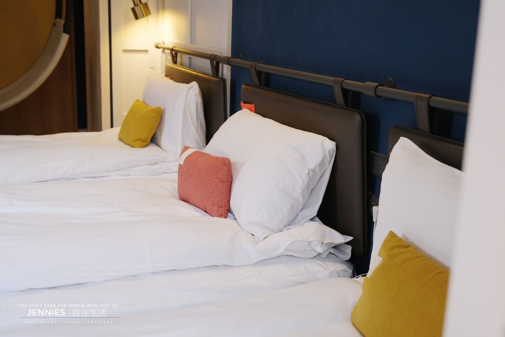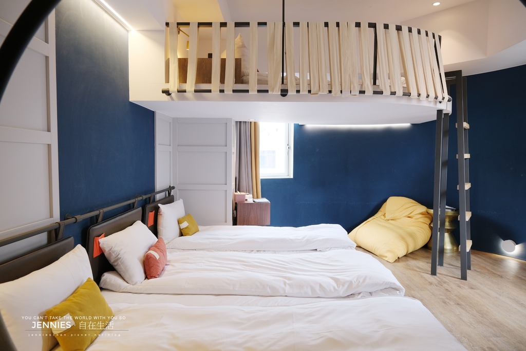 多張床鋪一字排開,適合家庭朋友一同入住,更像是在旅途中安排了一場睡衣派對,抱枕選用明亮的顏色點綴,讓心情也瞬間變得開心了起來。