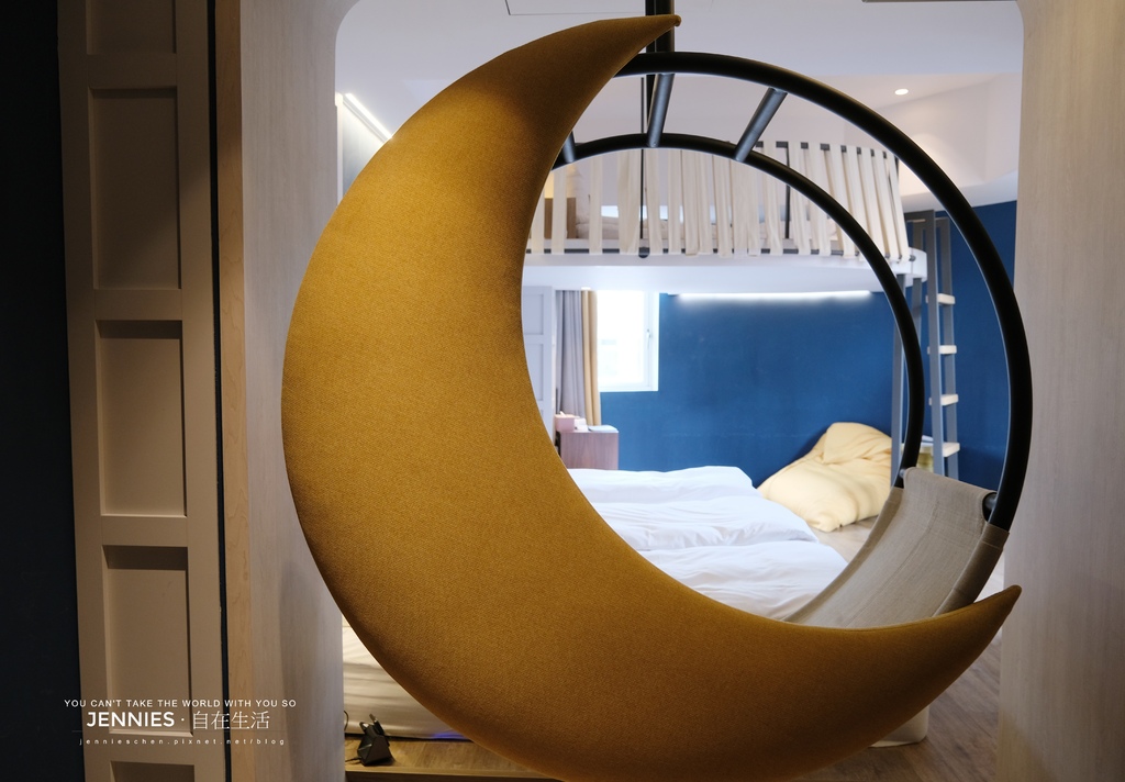 懸掛於房內的「月亮吊椅」好像童話世界裡的星空樂園,不論是坐著發呆、打卡拍照,還是和家人談天說地都別有一番魔幻情調。