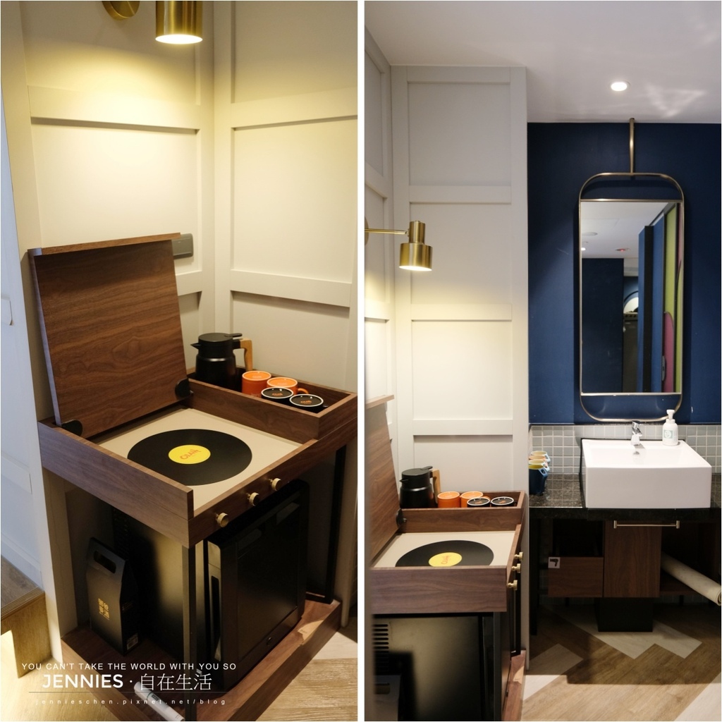 結合音符、唱片與復古燈飾,甚至連置物梯架都設計得像樂譜,讓生活機能與藝術共存;不忘備好熱水壺、馬克杯與隱藏式冰箱。還有藍牙音響,讓你一邊泡澡一邊放著屬於你旅程的BGM。