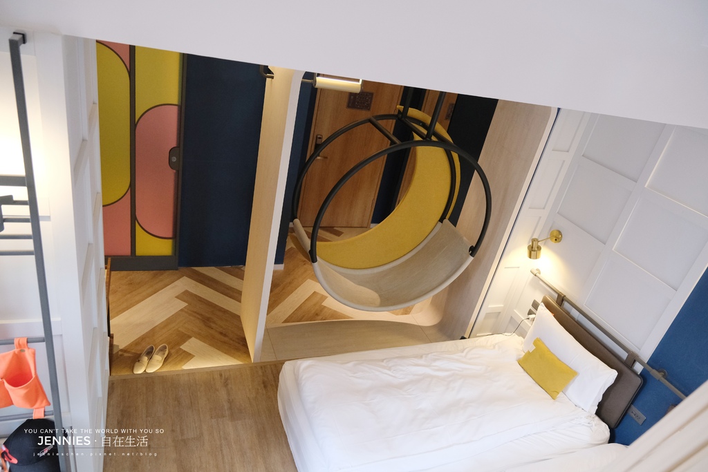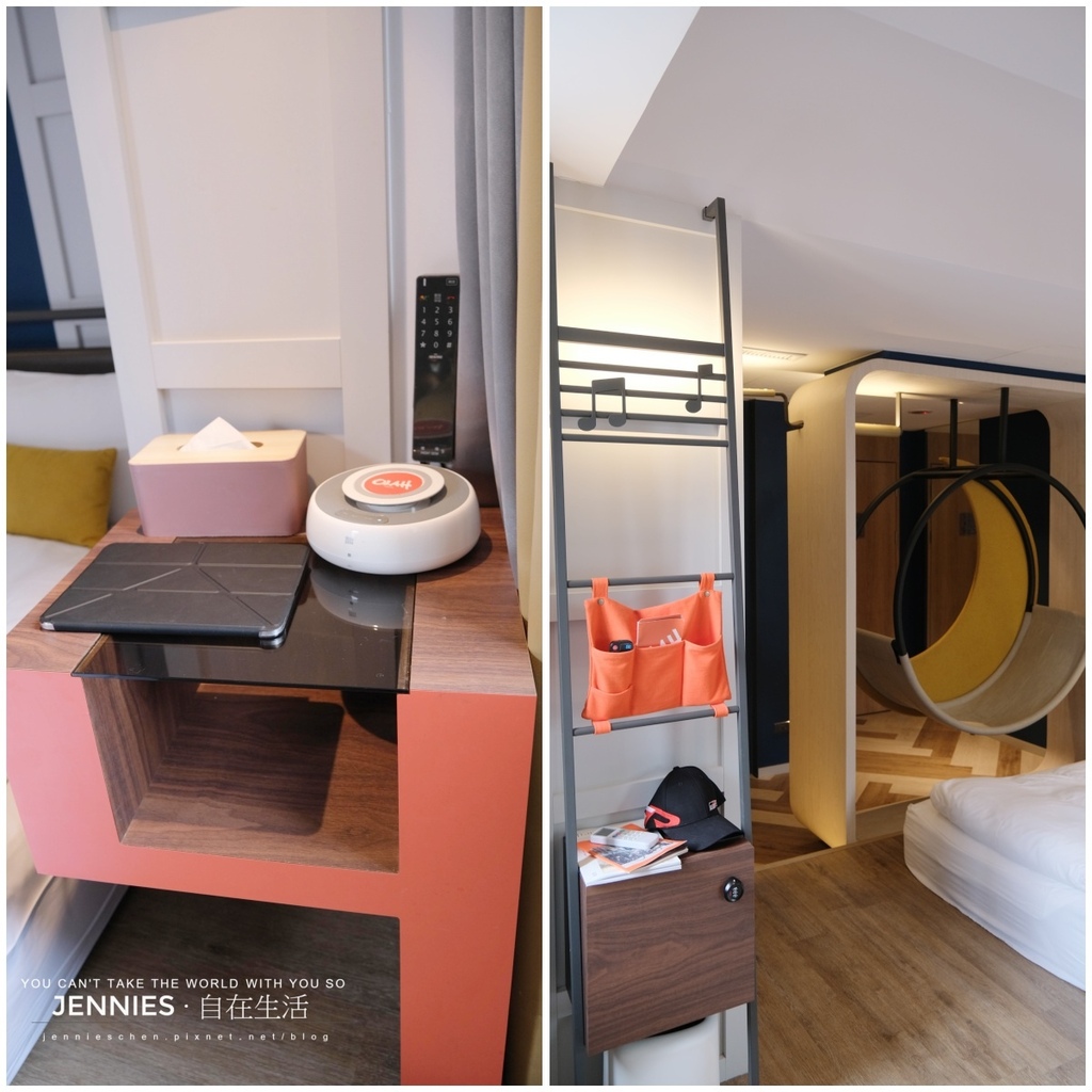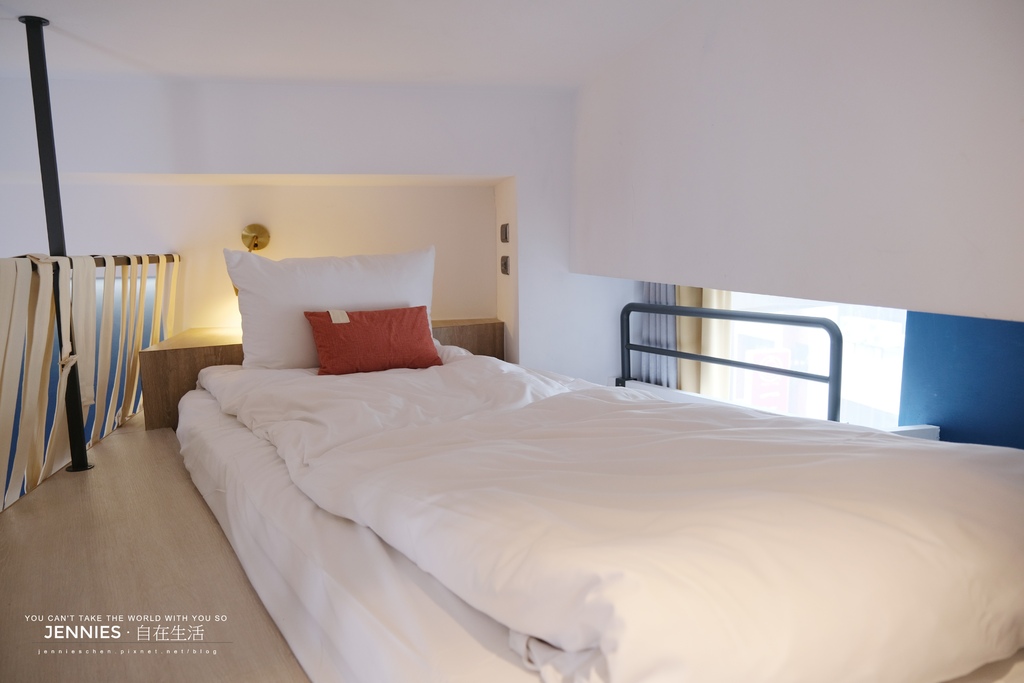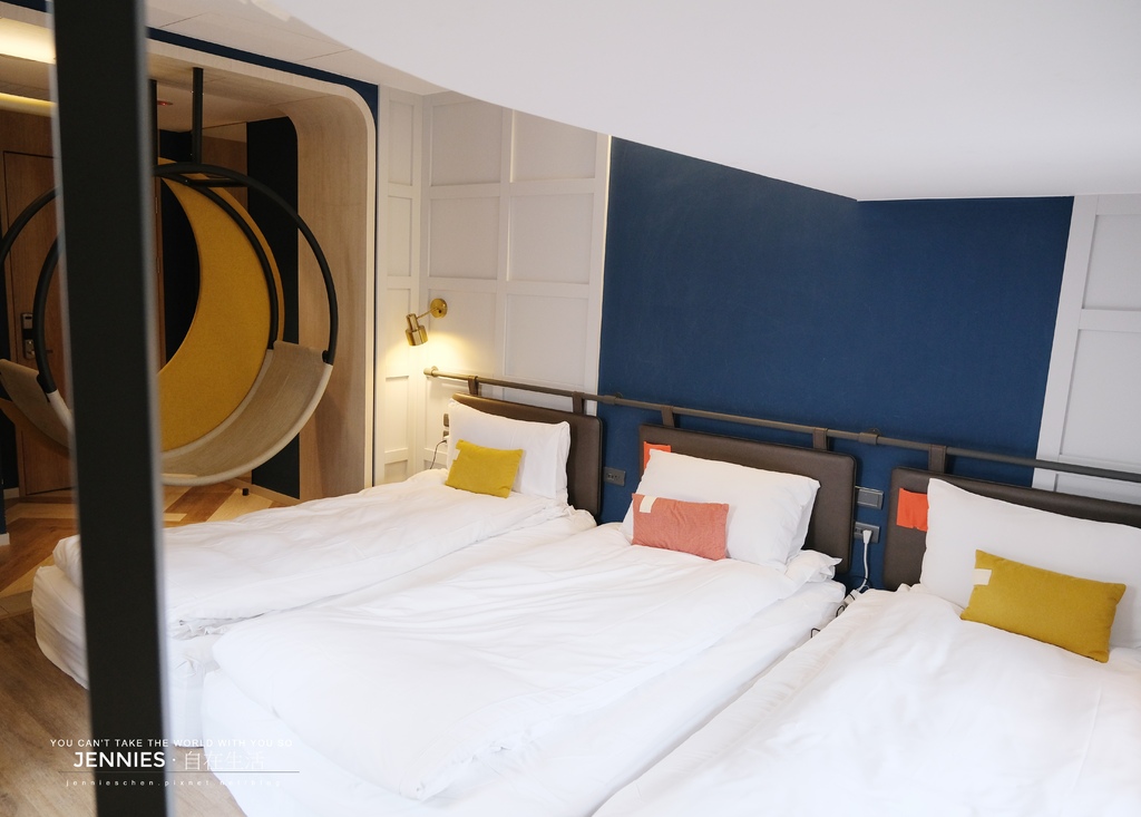 每張床舖旁邊也貼心設置了充電孔及小口袋,眼鏡、手機、耳機不怕找不到地方收放。房內還貼心放置了柔軟慵懶的懶骨頭沙發,無論是一早醒來還沒出門,還是午後想偷個閒,窩進去的那一刻,城市的喧囂都彷彿關在門外。