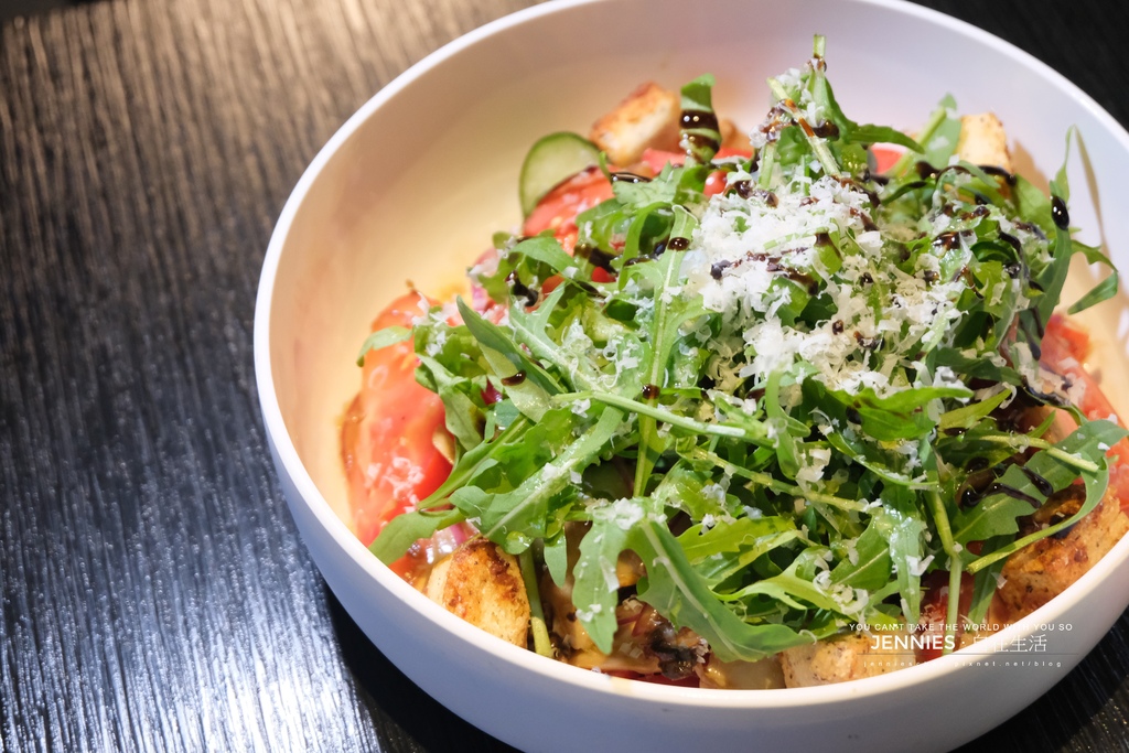 加上番茄、、洋蔥、小黃瓜、芝麻葉、麵包丁與現刨帕瑪森起司點綴,最後淋上初榨橄欖油與義式油醋醬,吃起來酸香平衡,各種鮮甜的滋味滿足口腹之慾,是一道很棒的開胃沙拉。