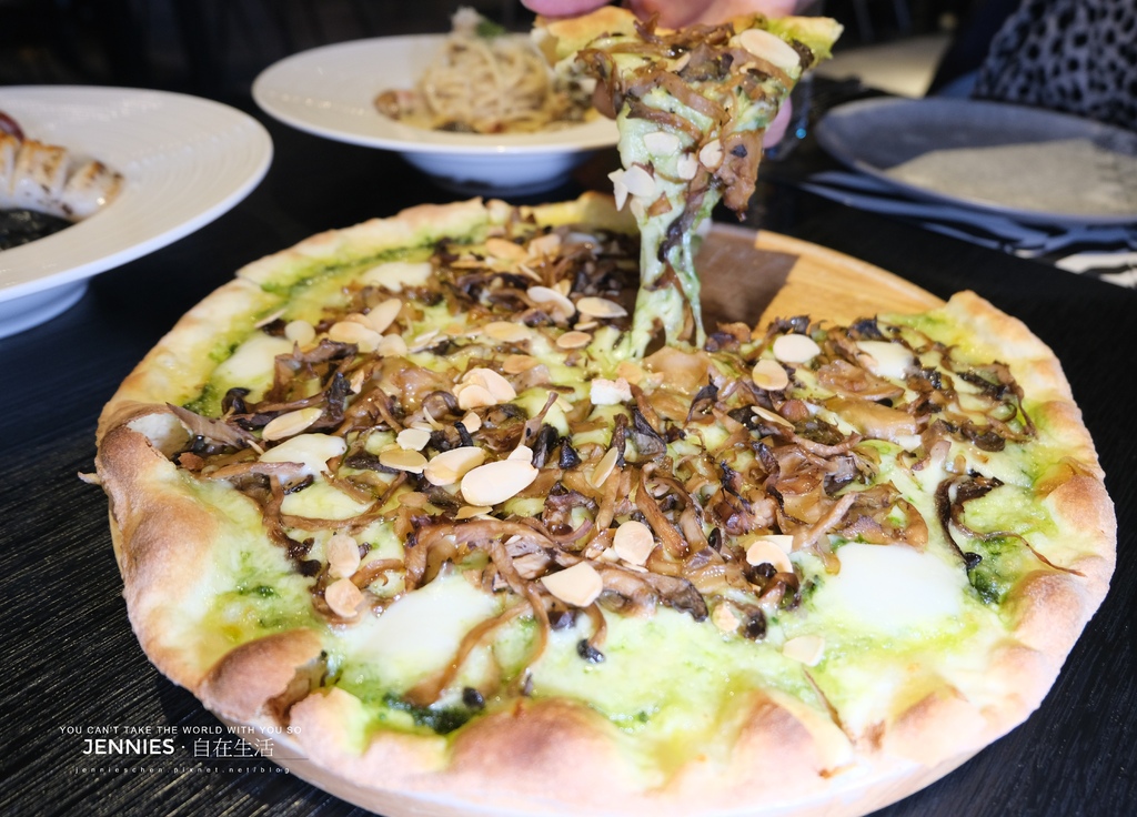這道人氣披薩以三種野菇(鴻喜菇、秀珍菇、杏鮑菇)為主角,搭配羅勒青醬與水牛乳酪綴以杏仁片,呈現出清爽中帶堅果香的美味氣息。