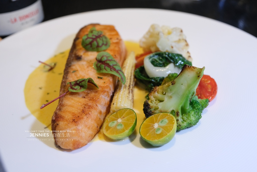 搭配炙燒花椰菜、番茄、菠菜與切半的金桔,層次分明好吃。