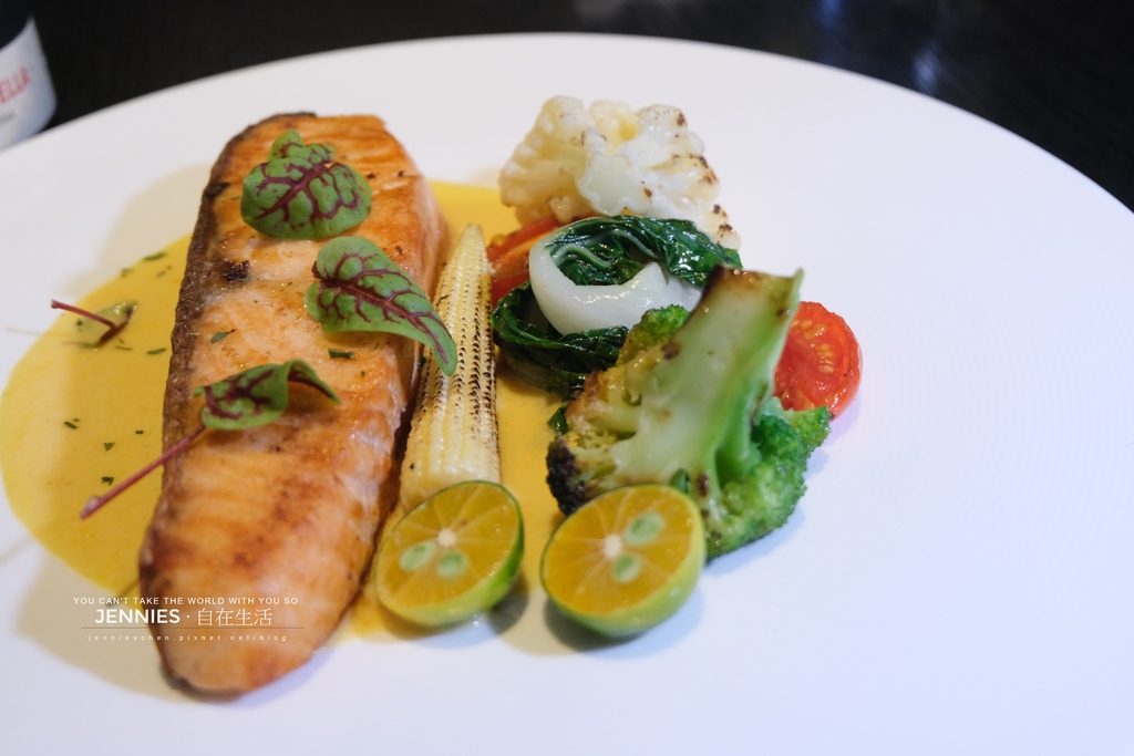 鮭魚外皮煎至微酥內裡仍保持濕潤柔軟;油脂與香煎的焦香完美交織。底下的奶油桔醬清爽中帶有微微柑橘的芳香,是今晚的亮點之一!!類似義大利南部常見的檸檬奶油醬變化版,帶點亞洲的清酸。好友對這道調醬讚不絕口-
