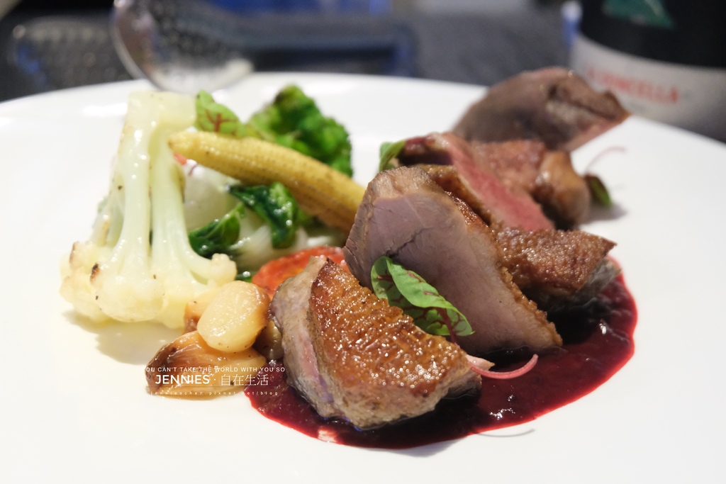 切開後內裡粉嫩保有恰到好處的肉汁。佐上野莓醬汁,以酸度鮮明的莓果與紅酒熬煮,帶出鴨肉的柔嫩,彷彿托斯卡納的森林裡飄來一縷濃郁果香。蒜香、玉米筍與小白菜作為配菜,呼應了料理的深度與親切感。這一道我也很喜歡-