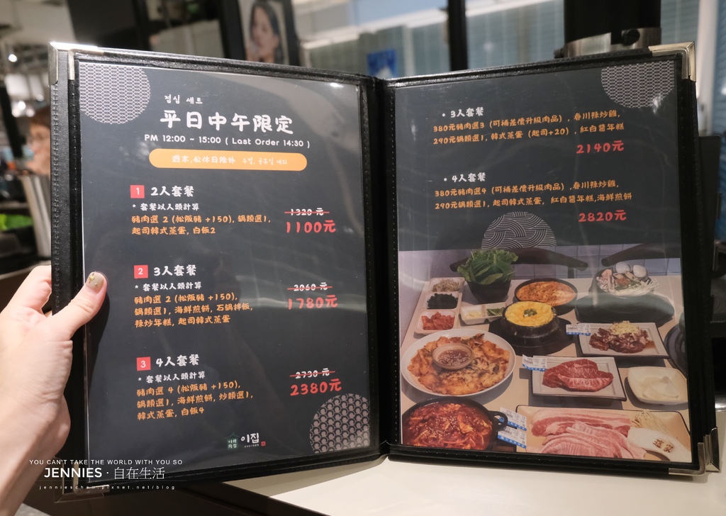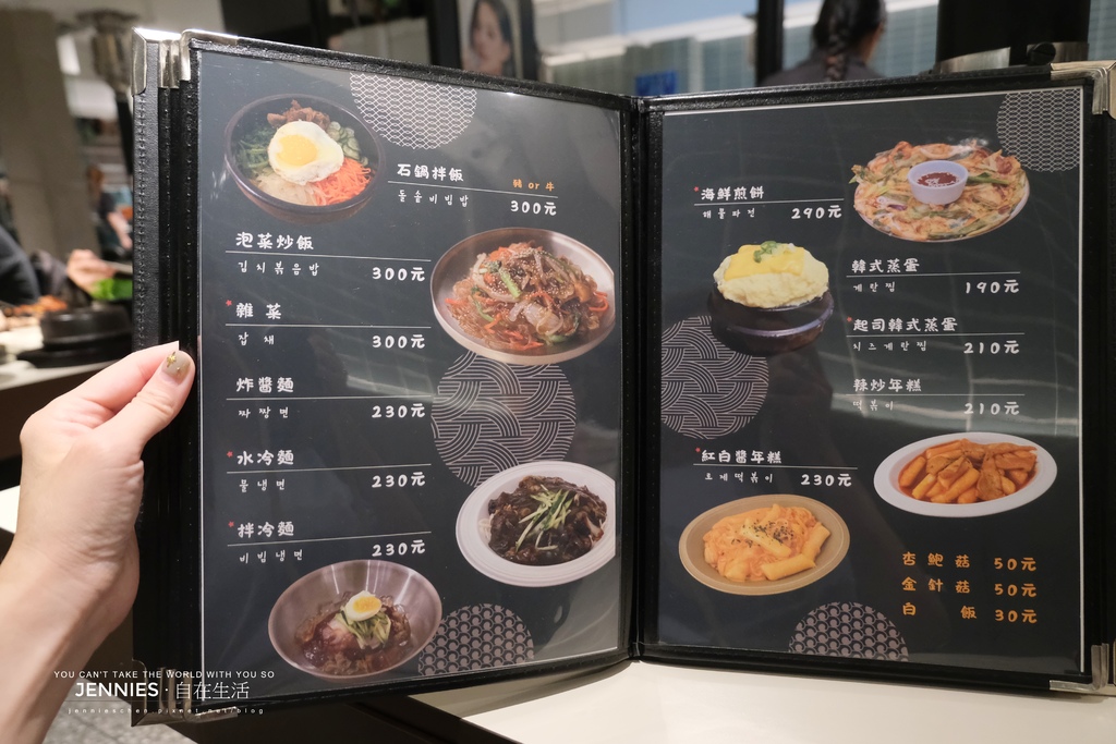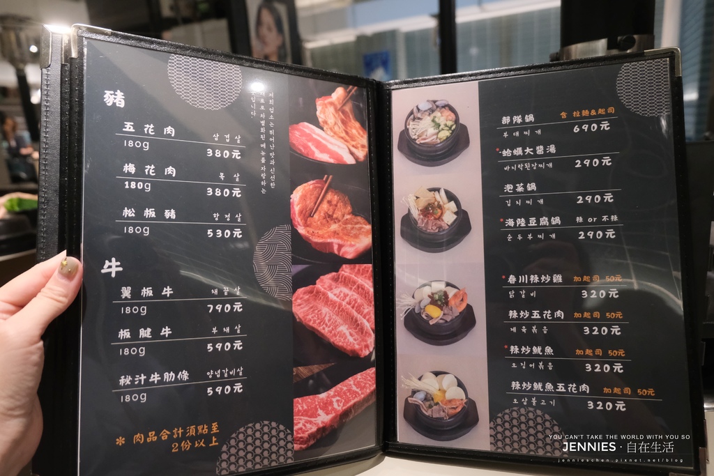 店內採平日中午限定(中午十二點至下午三點)分有二人、四人及六人的套餐;我們是平日的晚間來訪,所以一律採單點的方式,肉類有豬及牛、其它像是部隊鍋、泡菜鍋、辣炒五花牛、春川辣炒雞、石鍋拌飯、海鮮煎餅、水冷麵等這些常見的韓式料理都有,想吃白飯也可以另外加點。