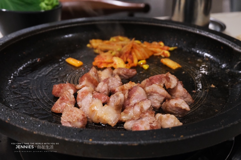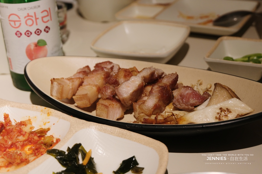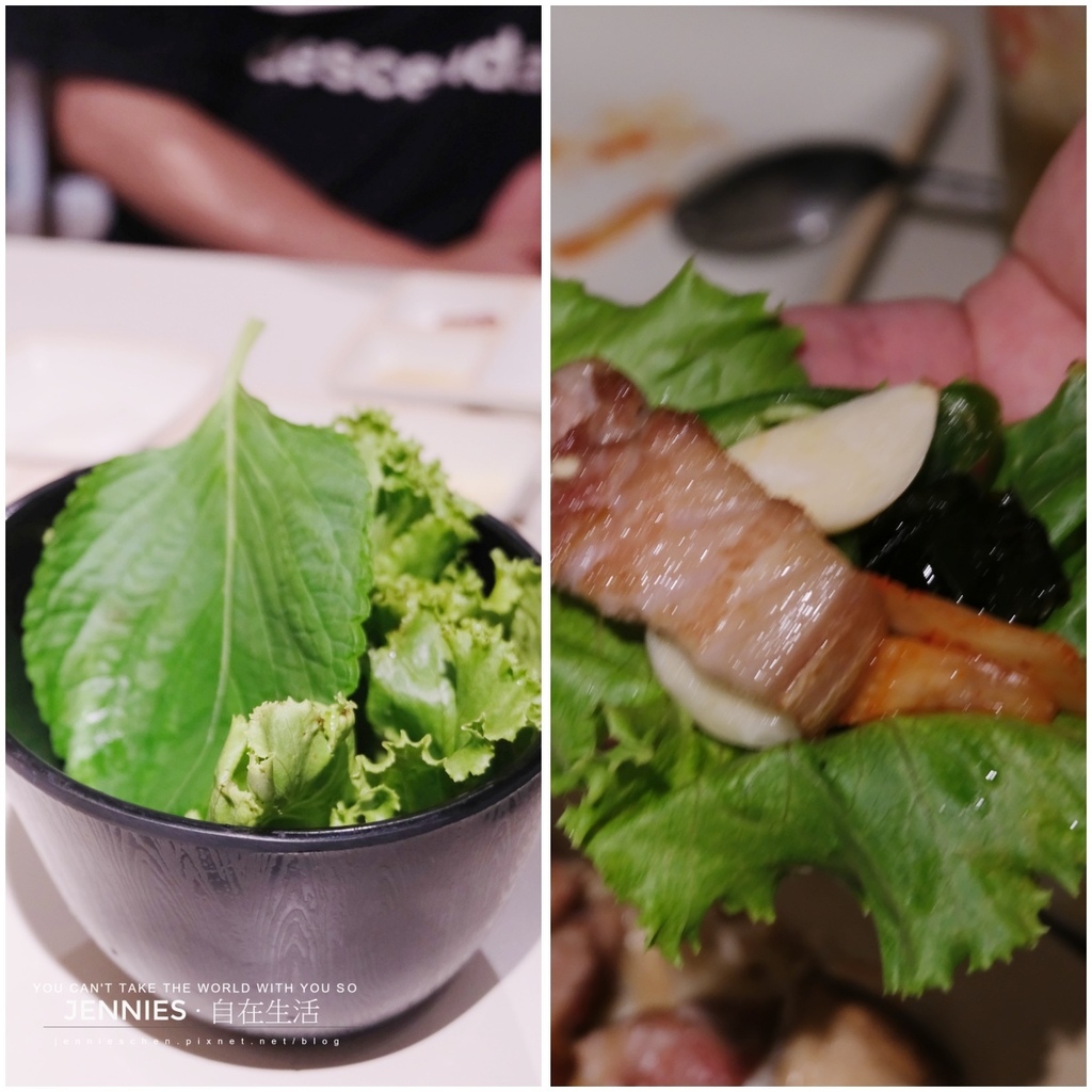 這邊提供二種生菜,可單獨使用也可以雙搭,除了放入燒肉也可以加入泡菜、蒜頭,沾上一點韓式辣醬,味道更是獨特迷人。今天點的是〈五花肉〉及〈梅花豬〉,三個人的份量頗為剛好。肉質吃起來也不錯,軟嫩度剛好,不會過柴還有豬肉QQ的咬勁,真是好吃!