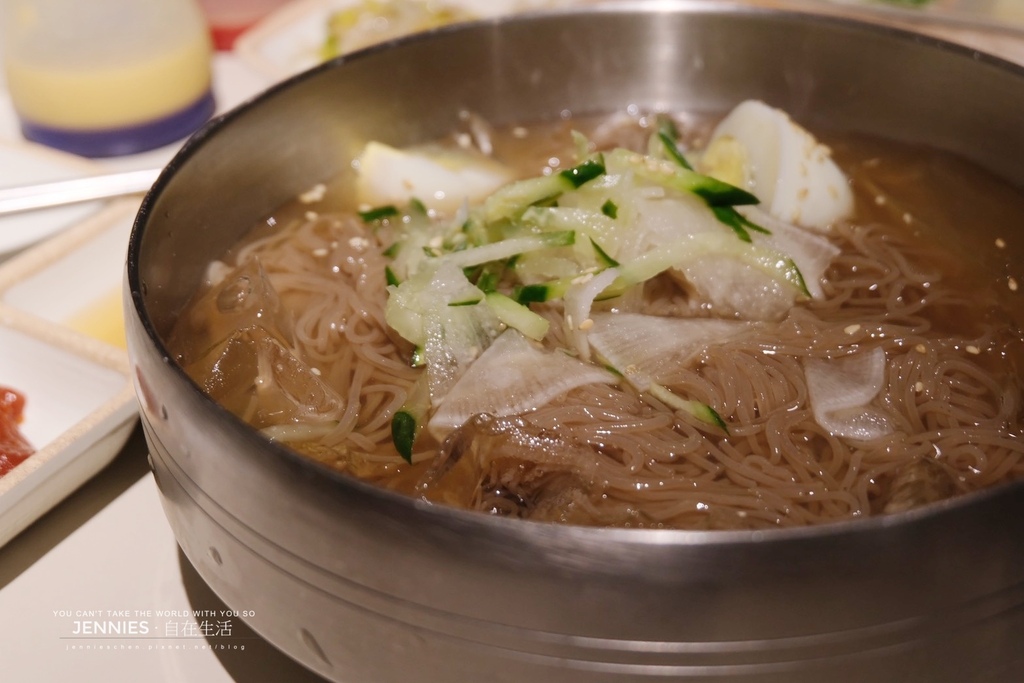 韓式水冷麵(물냉면)這家水冷麵是我目前吃到過最好吃的!!因為它沒有奇怪的藥水味,加入醋或是芥末都好吃,吃起來細滑中帶勁,咬不斷是它的特色,加上醋讓整體湯頭更為清爽,芥末則帶來微微嗆感,配料有白蘿蔔、黃瓜絲、煮蛋、芝麻,在韓國水冷麵幾乎是夏季的代表料理,尤其在汗流浹背的燒肉後來上一碗,簡直完美收尾!!