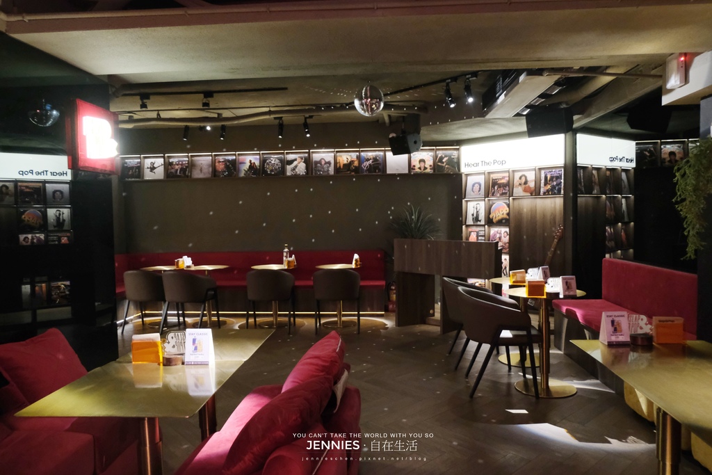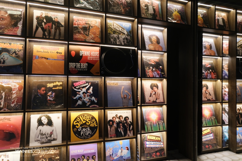 空間以黑膠唱片為設計,融合西岸LA的夕陽色調與東岸霓虹燈箱意象,創造出既懷舊又摩登的氛圍。