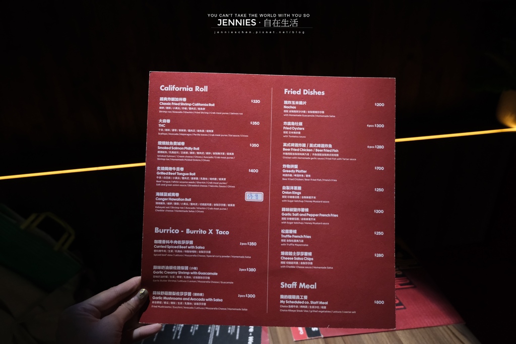 原本以為只是單純的酒吧,應該只有輕食!結果選擇超級豐富的,感覺不用續攤可以直接當晚餐+宵夜場;漢堡類的選擇很多,其它還有豬腳跟紅酒燉牛肉、墨西哥生牛肉等等。