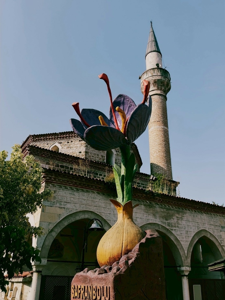 這是番紅花城(Safranbolu)的地標之一,每個人都跑到前面合影-番紅花雕塑(Saffron Flower Monument)。它的造型源自當地的經濟命脈:番紅花saffron。這種昂貴的香料是從花蕊中取出的金線般細絲,價值堪比黃金。早在17世紀,番紅花城便因生產與貿易這種香料而聞名於鄂圖曼帝國。盛開的花瓣象徵番紅花城在文化、手工藝與建築保存上的「再綻放」而花後面的的清真寺尖塔是守護這座城市靈魂的信重要信仰。