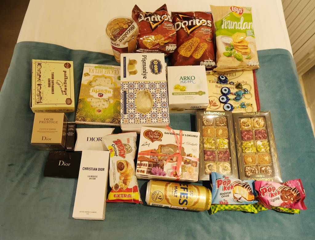 沿途買的戰利品,很多人會比價,但依我的習慣,只買自己要的無關在哪買,錯過這一站下一站不一定會有,自己買的開心比較重要!出發前我就先殺去Dior的專櫃,接著一路的旅程中也是慢慢累積,有些買來試吃看看體驗一下當地的飲食文化。土耳其的氣候較為乾燥,食物可以保存比較久,拿回台灣如果不趕快食用又會失去原本的味道,放室內陰涼處還是溼氣太重,原本很喜歡一盒吃起來像棉花糖的甜點,回台灣後沒注意一放就是二個禮拜,等我想起來要吃的時候已經結塊,嗚嗚嗚...照片最上方紅色包裝的洋芋片是土耳其限定口味;原本想把這包只有在地才有的的土耳其 Doritos(Turca 口味)帶回台灣!裡面居然有「罌粟花」對,就是傳說中會讓你從飛機直接走進關務室,然後走不出來的那種罌粟花。只好在這含淚默默吃掉它!不過網路上還是有人說可以帶,我不想冒險。下方的啤酒是土耳其相當有名的啤酒Efes Malt(艾菲斯麥芽啤酒)