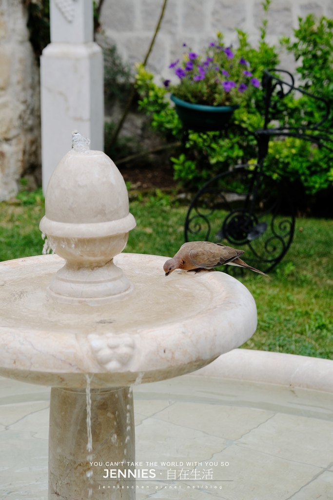 庭園有水井、噴泉,還有小貓恣意遊走,坐在這裡很舒服。許久沒有這麼放鬆,所有的煩惱好像都隨著陽光在山城裡慢慢消失。