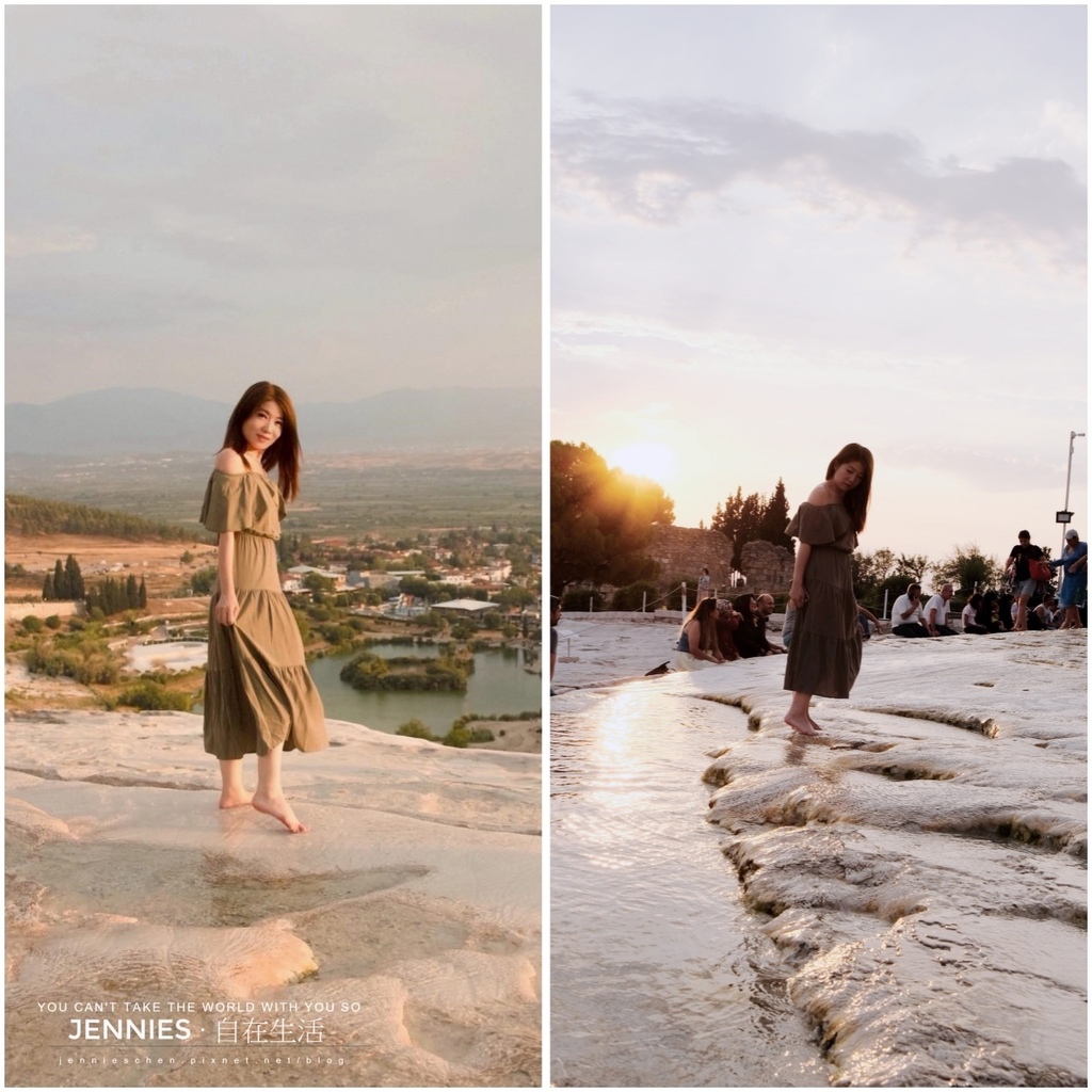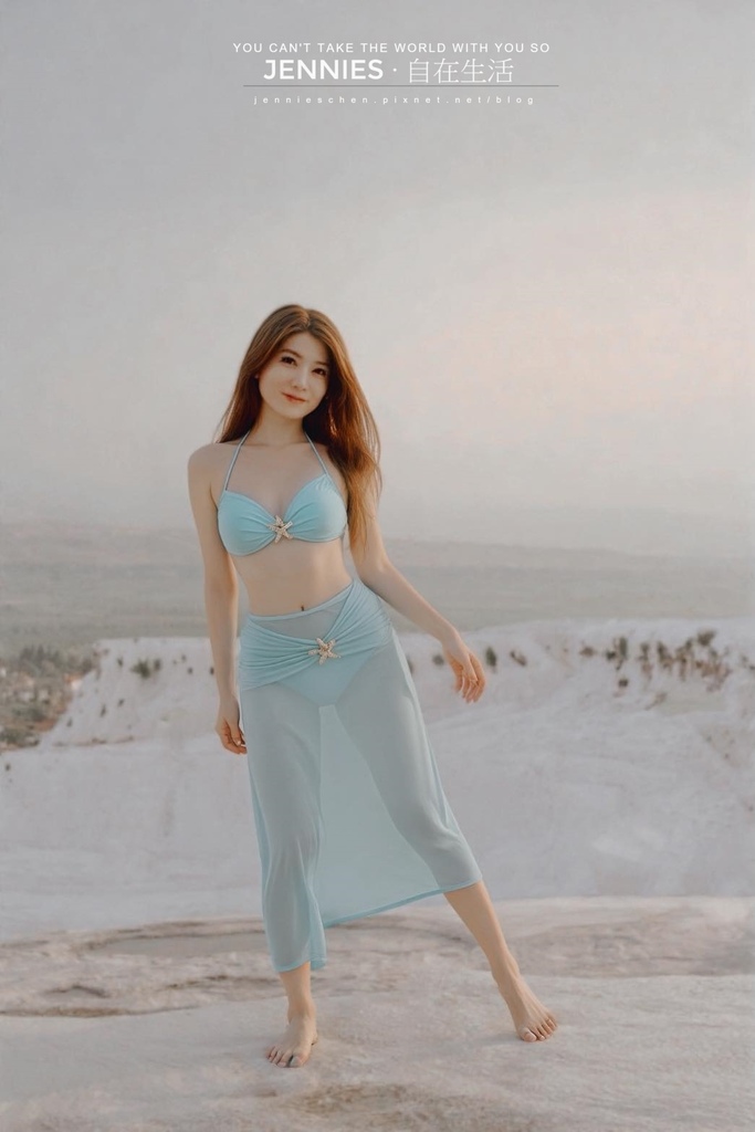 前一晚我們為了隔天要去棉堡,居然為了該穿什麼顏色的衣服傷透腦筋。到底要洋裝?還是連身裙?什麼顏色才不會被棉花堡的白色吃掉?還麻煩司機幫我們開行李箱,把衣服一件件翻出來,場面一度混亂。現在回想起來真是哭笑不得。用AI換裝就好了!什麼顏色都有(笑~)圖為AI換裝。