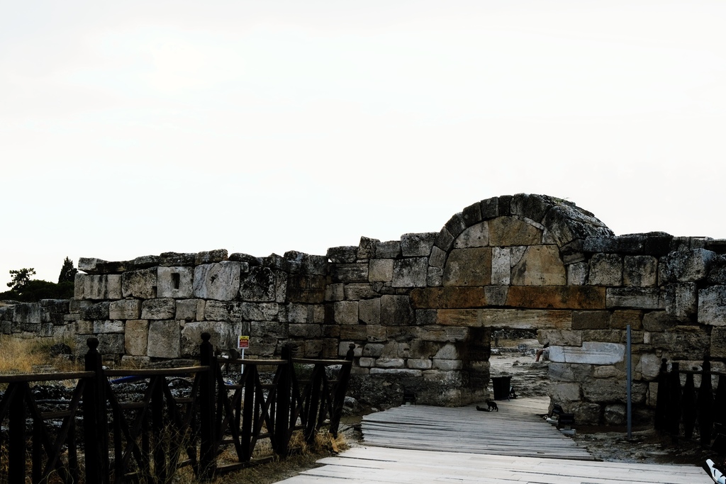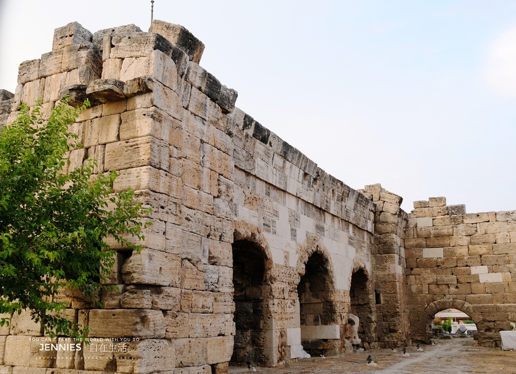 沿著古道往前走,一座由厚重石塊堆砌而成的拱門映入眼簾,這裡也是希拉波利斯古城的一部分。原本以為可以進去參觀,但繞了一圈不得其門而入。經過兩千年的風蝕與地震洗禮,石牆依然屹立。