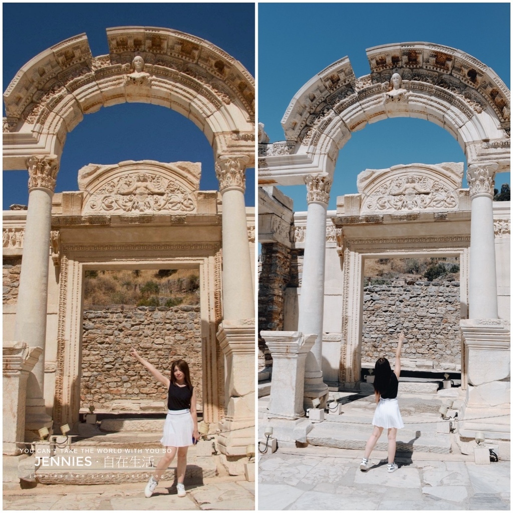 我站的位置靠近它的上端入口處,就是人們俗稱的勝利之門Gate of Hercules。這座門原本是艾菲索斯城的分界線,將「上城」(政治、宗教區)與「下城」(商業、文化區)分開。它之所以被稱為勝利之門,是因為門楣上刻有半浮雕的赫拉克勒斯(Hercules)雕像,象徵英雄的力量與保護,通過此門就象徵步入城市的榮耀大道。門體雖不高但設計精緻比例優雅,是古羅馬裝飾藝術的經典範例。