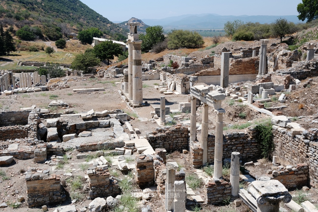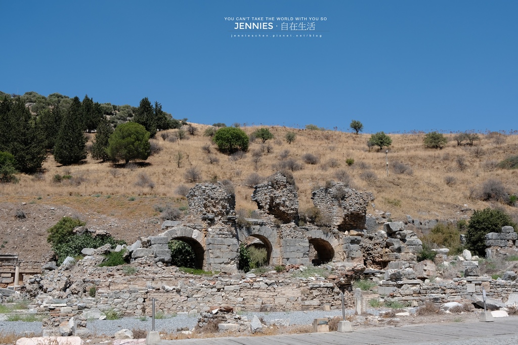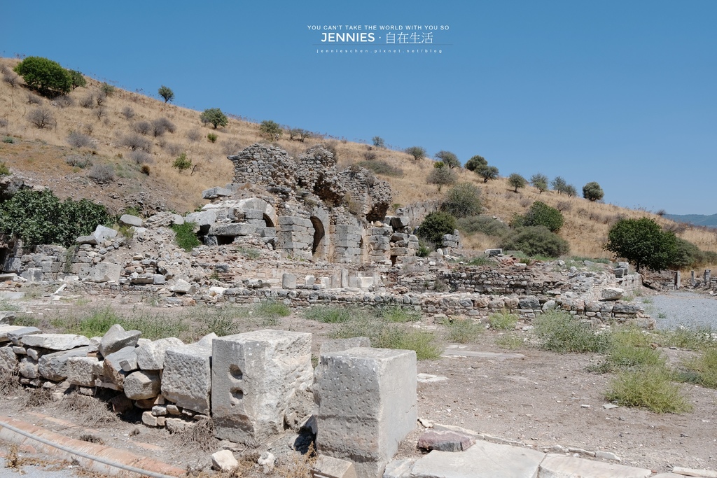這片廢墟看似只是石堆其實曾是羅馬人最重要的公共設施之一。在艾菲索斯全盛時期共有四座大型公共浴場,而這裡是其中一座貴族與官員專用的浴場區。它的位置位於哈德良神殿之後、靠山坡的地帶。在古羅馬文化裡浴場是社交、政治與哲學辯論的中心,甚至可以說是「古人的咖啡館+健身房+沙龍」浴場外還有更衣間、噴泉、中庭花園,有時甚至有音樂演奏。考古學家在地板下發現過許多小陶片上頭寫著名字與數字,那是「入浴憑證」也有人說是「偷情暗號」。畢竟,浴場的蒸氣總能模糊界線。