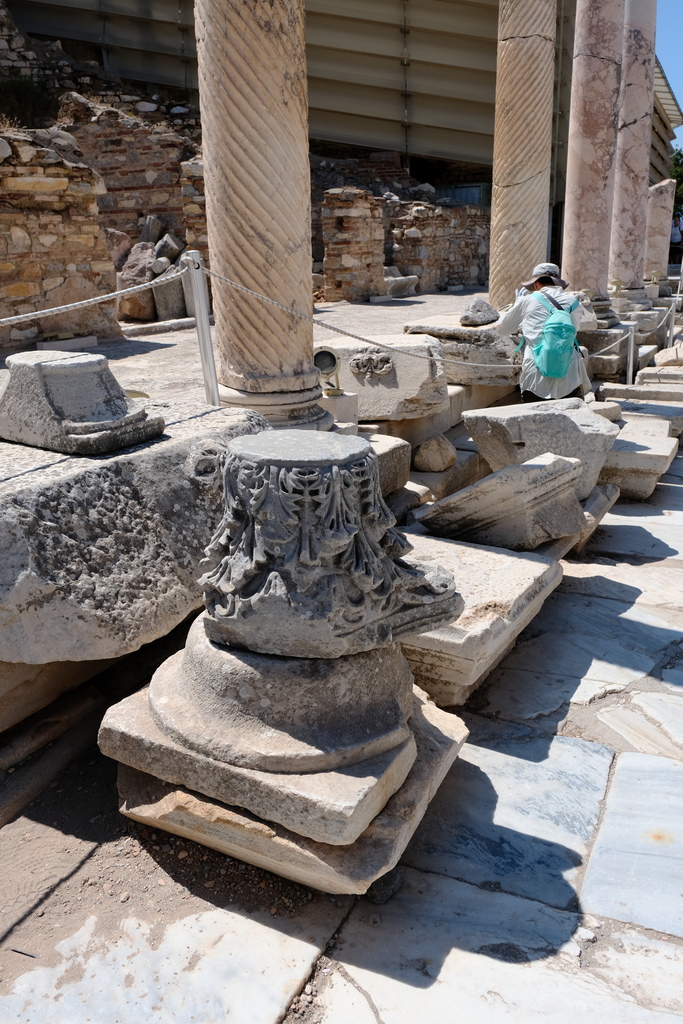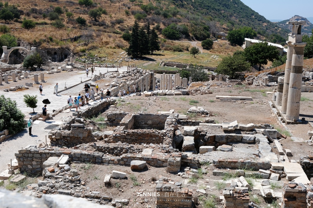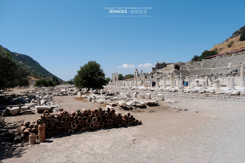 港口大道(Arcadian Way)通往大劇場前段,這條大道是古代艾菲索斯最宏偉的道路之一,全長超過530公尺寬約11公尺,兩側有列柱、雕像與石燈,是迎接從港口抵達城內的旅客的第一印象大道。左方堆積的那些陶製管與石塊,則是考古學家從地下挖掘出屬於古代排水與加熱系統的遺件。