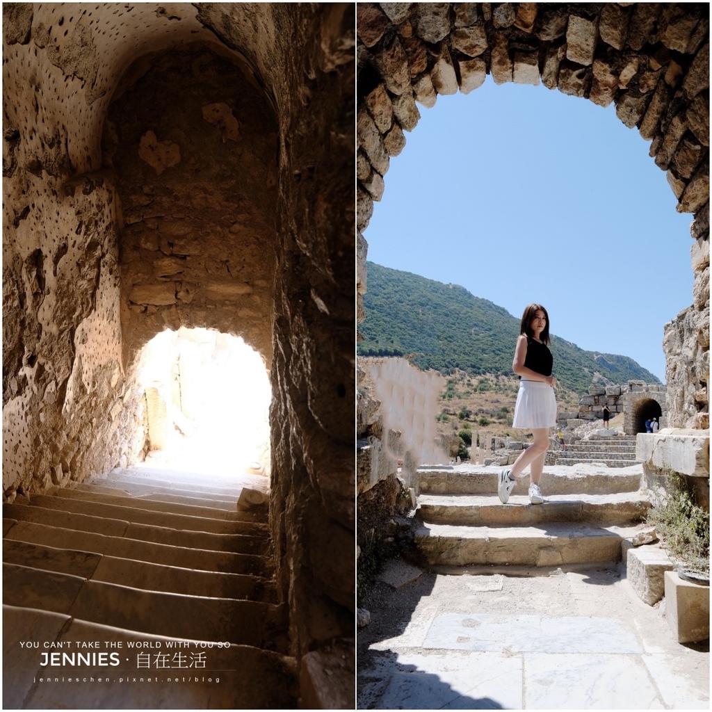艾菲索斯遺跡裡少數仍保有完整地下拱形通道(vaulted corridor)結構的區域,也就是古代貴族住宅群中連接房間、儲藏間或僕人動線的密道。這類石拱通道在艾菲索斯主要出現在兩個地方:山坡屋群(Terrace Houses)位於庫瑞特大道旁的山坡住宅區,這裡的富人住得奢華又精密。通道可能是僕人通行或搬運物資的後段動線;通往浴室、地窖、或暖氣系統(hypocaust)的維修通道;部分學者甚至推測,某些密道可連通至街道外的商店或私會之處。公共建築的地下通風道:例如在圖書館或浴場附近,也有類似的通道設計,用於控制溫度與濕氣、避免書卷或壁畫受潮。