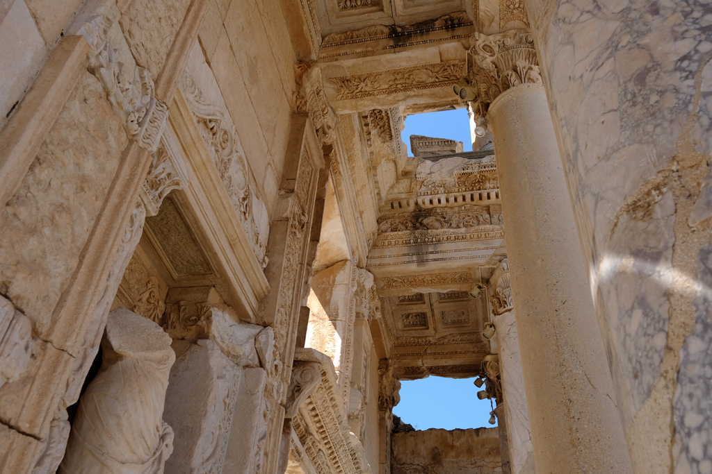 這是艾菲索斯的靈魂。正面兩層、實際內部四層的設計,是古代圖書館建築的巔峰之作。書櫃可容納上萬卷羊皮紙卷軸,也是拍照最具代表性的地標。