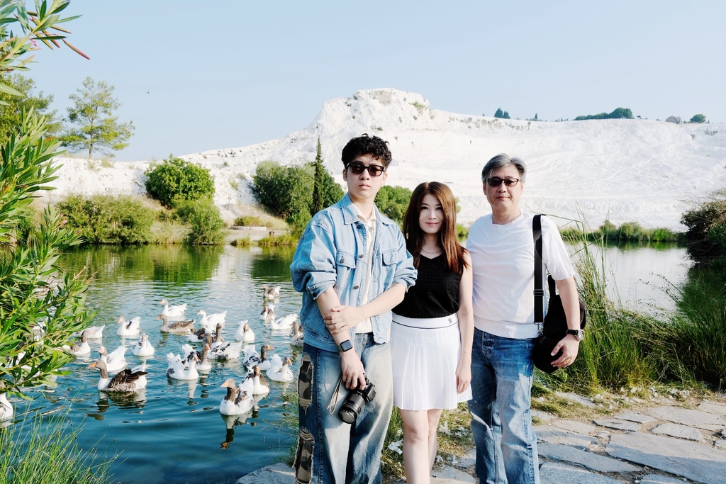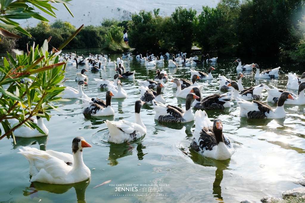 車子緩緩駛近棉堡的白色山壁,我們來到一座靜謐的湖畔,水面波光粼粼倒映著遠方雪白的石灰岩。就在我們還沒完全反應過來時,成群的鴨子迎面而來。牠們不慌不忙、井然有序地朝我們遊近,羽毛在陽光下閃著銀白光澤。實在好夢幻啊!!