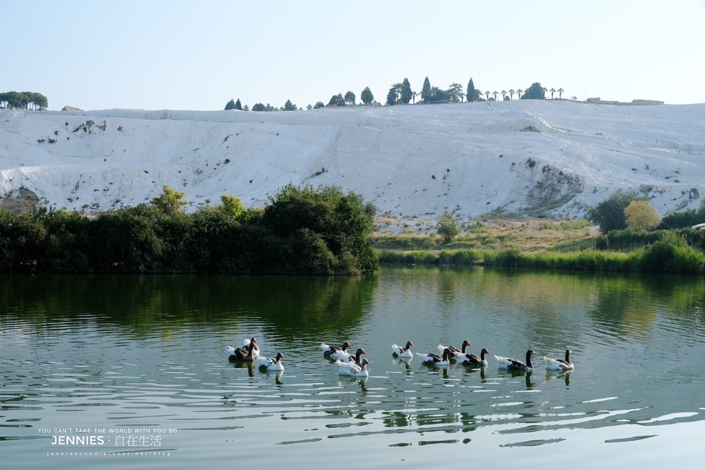 從湖邊望向前方那白色山丘就是棉堡最著名的鈣化梯田。當白色山丘倒映進綠意與湖水整個景致柔和得讓人屏息。看著鴨群在水面上排成隊形,偶爾還會有幾隻頑皮地潛入水中。