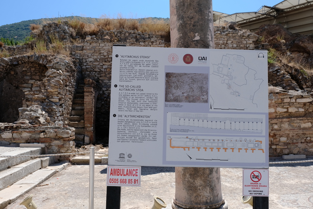 這是一座建於西元四~五世紀(晚期羅馬帝國時期)的長形廊柱建築(Stoa),位在著名的Curetes Street庫瑞特斯大道旁,正好介於兩棟梯田屋(Terrace Houses)之間。Stoa在希臘語中意為有頂迴廊,既是公共集會、散步、商談之地也是城市美學的延伸。這棟建築約寬4.7~5.5公尺與周邊道路有2.5公尺的高差,考古學家發現其中鋪有彩色馬賽克地板,並飾以幾何圖樣、花卉與人物紋飾,可見這並非一般商業走廊而是高階社交與榮耀展示空間。