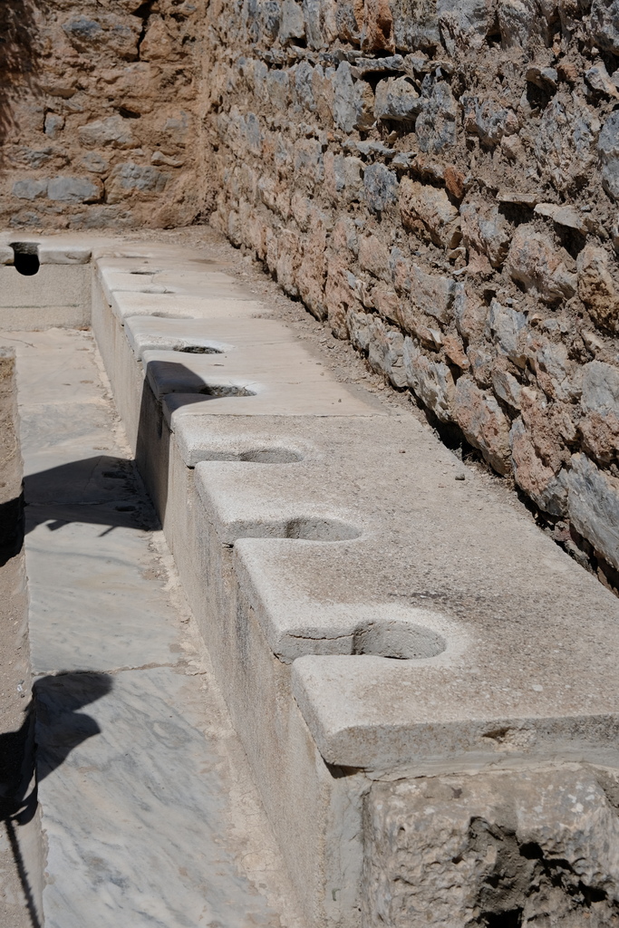 這處公共廁所位於哈德良神殿(Temple of Hadrian)旁、山坡屋區入口對面,建於西元1世紀,是城市重要的「公共衛生建築」。它連接著下方的排水系統與浴場的溫水管線,所以即使是廁所,也擁有恆溫、通風、排水完善的設計。可以看到石板上排列的方形孔洞,那就是當時的「座位」。