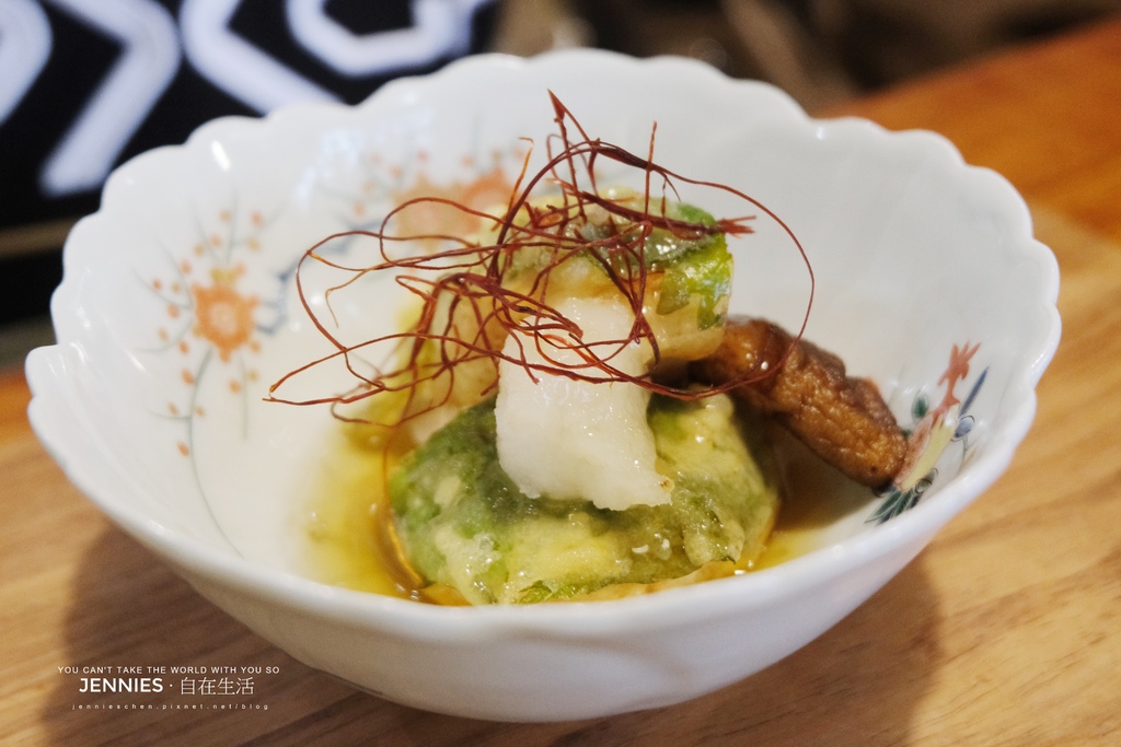 先以三道時令小品揭開序幕,每樣單品清雅而細緻像秋風初拂帶來開胃的輕盈氣息。鮭魚吃起來油脂豐美,撘配一旁的蘿蔔襯著翠綠的紫蘇葉與帶有果香的金桔,色彩對比鮮明,也預告了入口時的滑嫩與溫柔,有如秋日夕陽的光暈,細膩的口感讓人慢慢咀嚼其中;一旁的蔬菜碧綠汆燙後仍保有脆度,上頭撒上柴魚絲,胡麻醬汁輕輕沾覆帶來淡雅的鹹香與甘醇。