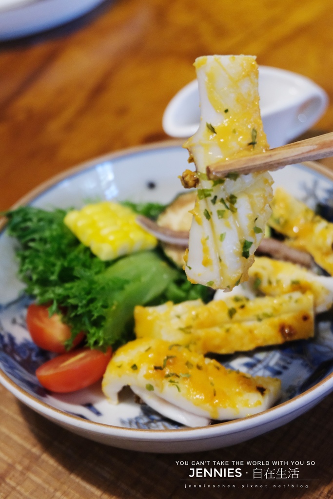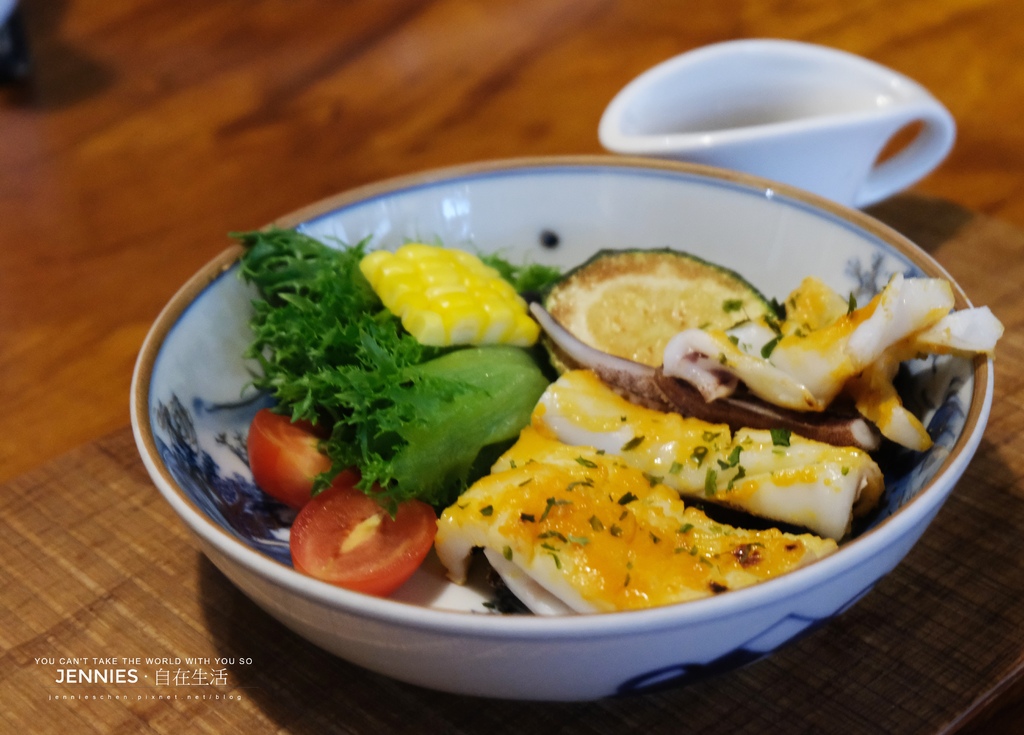 嚴選來自吉品的野生軟絲,切片後以火炙烘托,表面微焦卻仍保有鮮甜水潤的口感。抹上海膽醬為清爽的軟絲添上一抹濃郁海潮氣息,鹹香中帶著甘美與當季時蔬沙拉交織出疊疊層次。