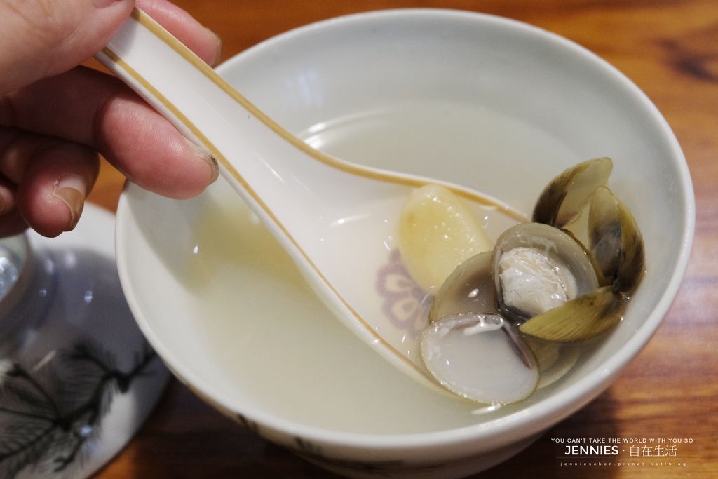 選用台灣黑鑽蜆與日本大和蜆細火慢熬,湯色清澈卻蘊含深邃的海之氣息。入口時濃郁得幾乎像蜆精般直擊味蕾,鹹香鮮甘在舌尖層層堆疊,尾韻久久不散。在家裡即使耗上整日,也未必能熬出這般純粹而渾厚的滋味。喝完後,身體像被溫柔的食材所滋養,那一瞬間,仿佛連身心都獲得了修復。無二這邊也有提供酒精性飲料搭配,單杯酒加點有果實酒及清酒可選擇-