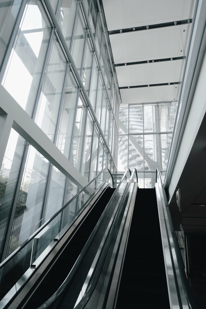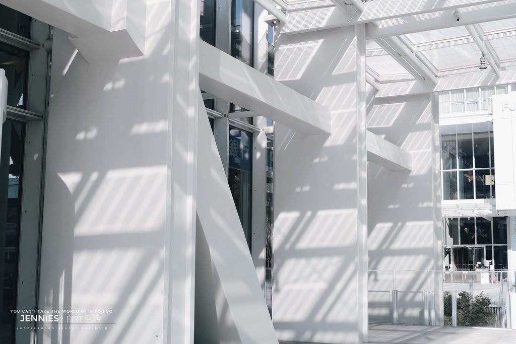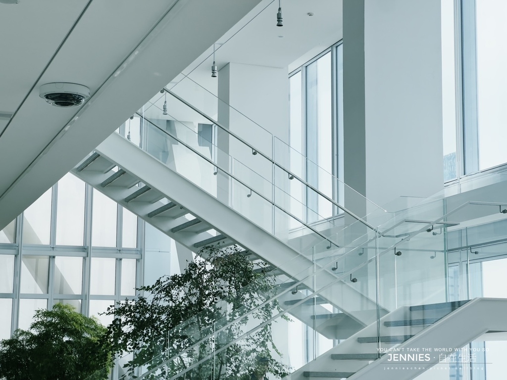 潔白鋼構與玻璃扶手交織出輕盈的垂直節奏,自然光穿透高窗灑落,讓整體空間呈現出「光之建築」的純淨語彙。抵達咖啡廳的樓層,也太美了啦!!